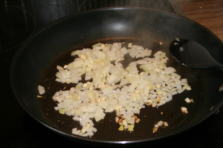 Zunächst müsst ihr die Zwiebel und die Knoblauchzehen würfelig schneiden und im Distelöl glasig anbraten. Gleichzeitig stellt ihr einen Topf mit Salzwasser für die Nudeln auf eine andere Herdplatte.