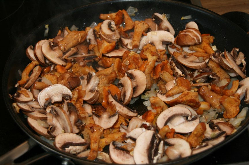 Anschließend gebt ihr die Pilze dazu und vermischt alles. Nun könnt ihr den Deckel der Pfanne schließen und alles andünsten lassen. Nach ca. 5-10 Minuten (je nach Pilze) stäubt ihr die Pilze mit ein wenig Mehl und rührt um.