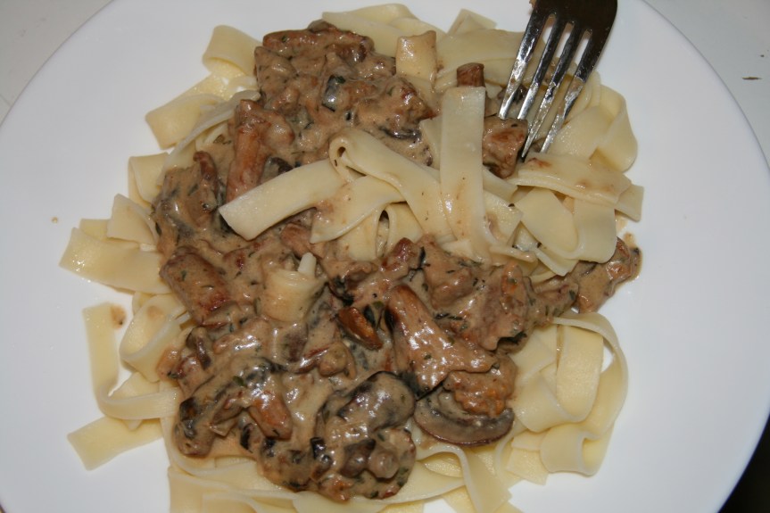 Die Sauce passt neben Nudeln auch wunderbar zu Semmelknödel oder Serviettenknödel. In unserem Fall haben wir eine halbe Packung frische Champignons und eine halbe Packung Tiefkühl Eierschwammerl verwendet. An dieser Stelle muss ich aber wärmstens von Tiefkühl Pfifferlingen abraten, da sie uns nicht so gut wie frische geschmeckt haben.